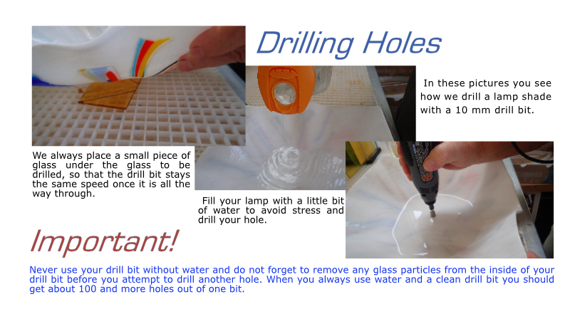 Our drill bits have an 1/8" shaft and are designed to be used in a hand held drill. They have open cylinders with little holes for easy glass residue removal. The industrial diamonds are metal-bonded inside and outside of the cylinders. With proper care they will last for many holes.
